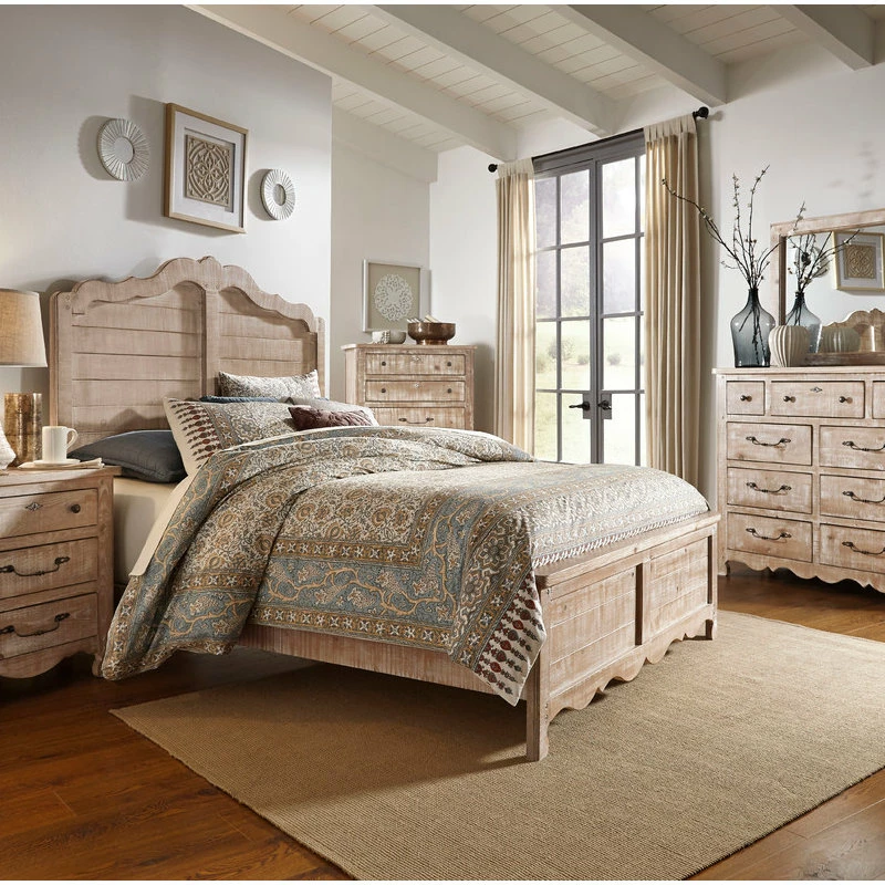 This bed features flowing molding that captures horizontal solid wood planking. Footboard features scalloped base molding. Chalk finish is hand applied on rough sawn pine to achieve a vintage, one of kind look.