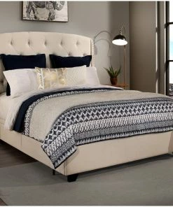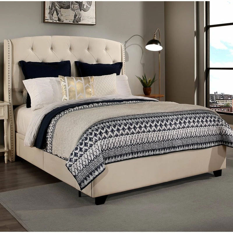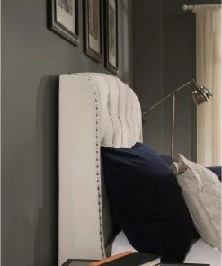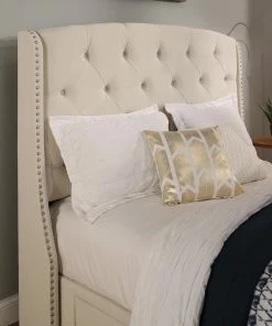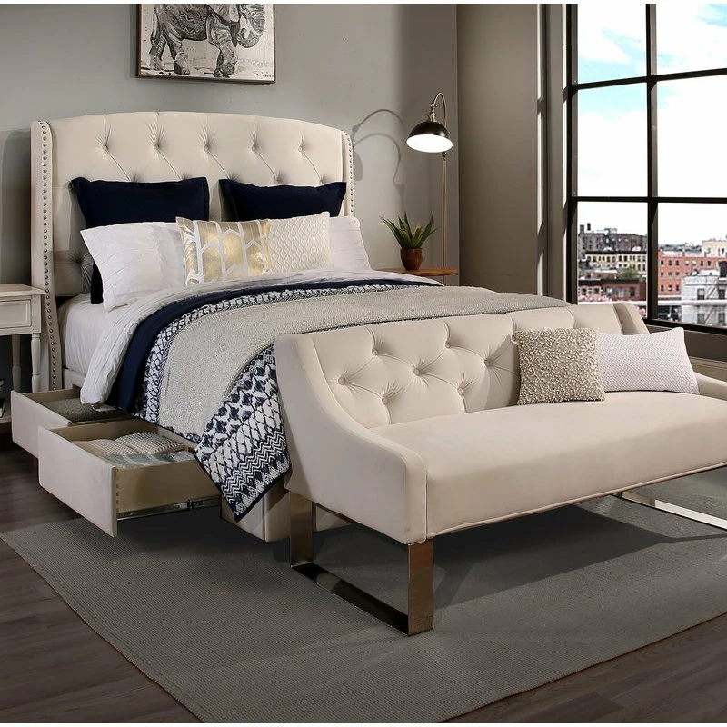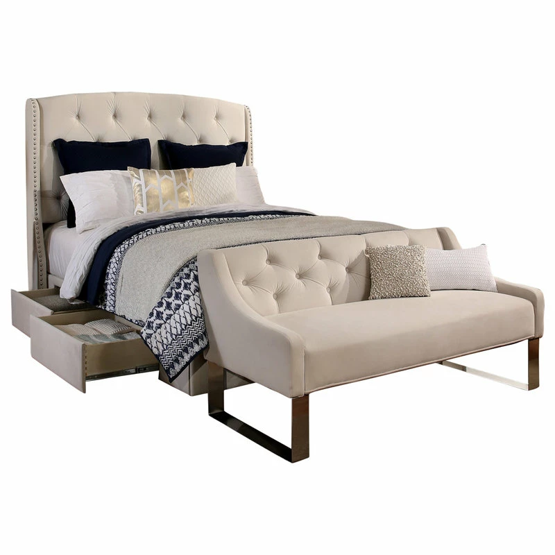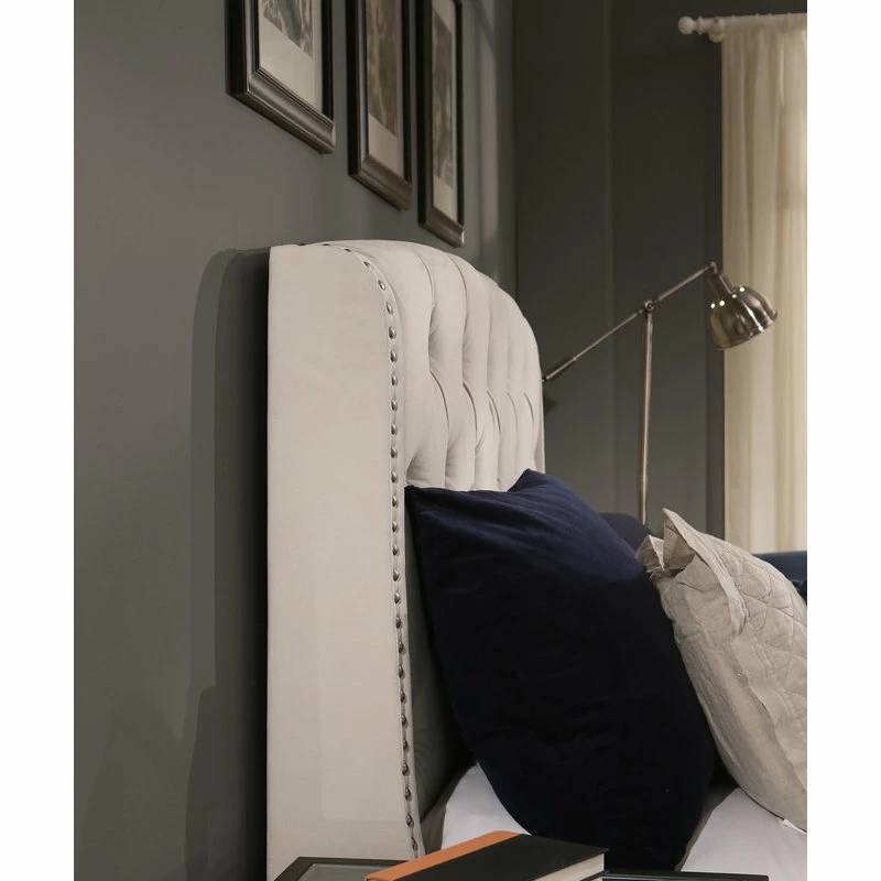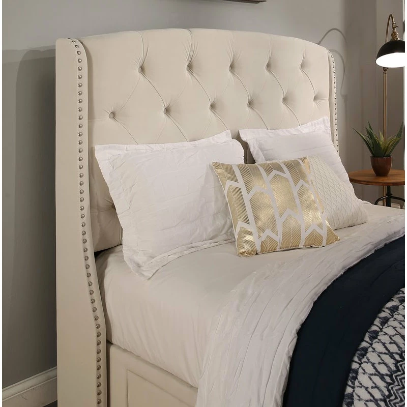Create an elegant yet cozy look for your bedroom with this charming storage bed. The Peytonheadboard, thickly padded and tightly upholstered, is detailed with deep button tufts combined with a brushed nickel nail head trim bordering the wings.