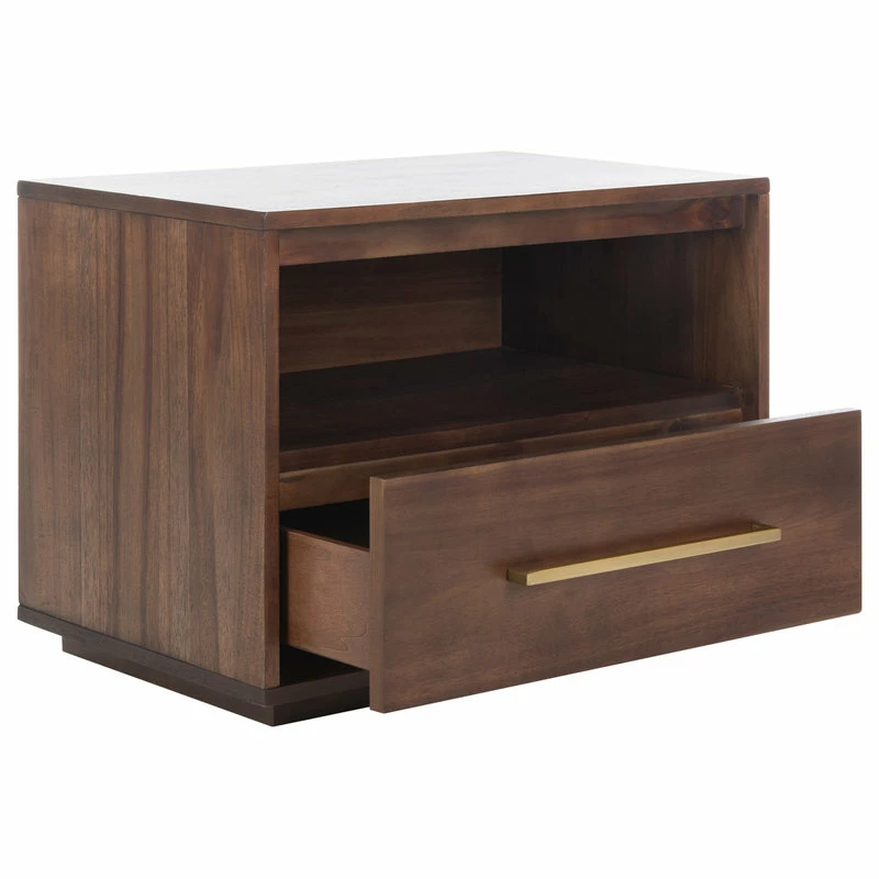 Designed to highlight its uncompromising craftsmanship, this luxurious 1-drawer nightstand is a modern heirloom. Its exquisite solid acacia wood construction features a rich chocolate brown finish and chic metal handles that highlights its natural beauty.