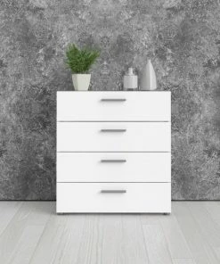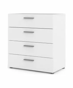Slender and sleek. Austin 4 drawer chest offers space saving alternative that can hold a variety of items in its wide drawers, from guest linens to daily entryway necessities. The unique depth makes this piece an ideal addition to bedrooms, Living areas, or entryways. Streamlined hardware and round feet give the Austin line its simple chic feel. Standing strong with metal drawer liners and an easy to clean foil surface the Austin dresser will be a productive and durable piece in your collection.
