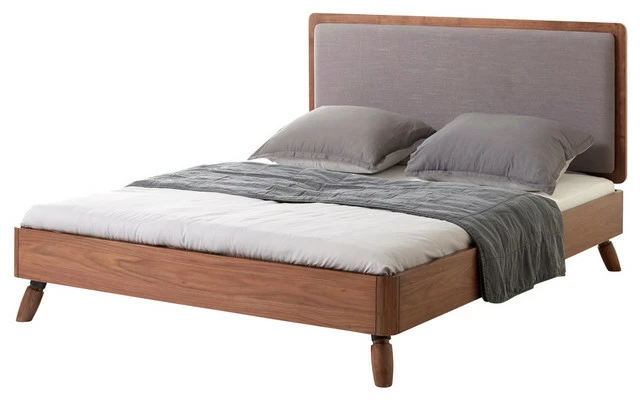 Inspired from Danish mid-century modern design, the Angelina Bedroom collection is a stylish addition to your bedroom. The curved framing of each case piece is perfectly accentuated by soft mitered handles and features soft-close mechanisms on the doors and storage drawers for quiet and sure closure. Beautiful Grey fabric surrounded by the curved framing makes the headboard a subtle stand-out, providing contrast in materials. All pieces in the collection feature tapered legs that are signature to this classic look. The Collection is crafted by hand and made with solid American walnut wood.