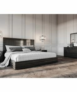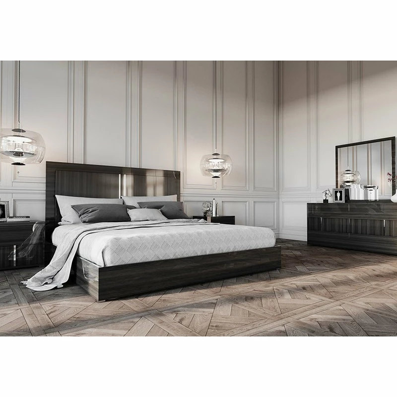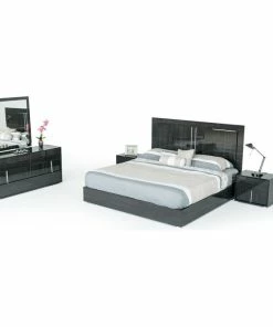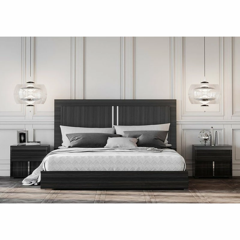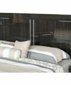 Offering that hotel-like feel is the Modrest Ari Italian Modern Gray Bed in luxurious gray lacquer finish. The bed features a tall headrest with vertical silver accents in the middle and a recessed mattress frame featuring wood orthopedic slats for mattress ventilation.