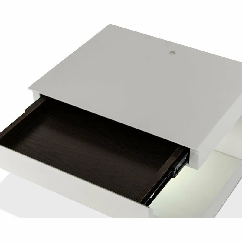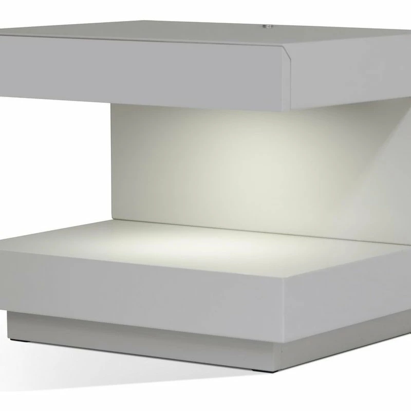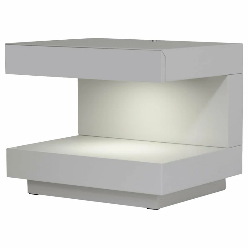 The Modrest Esso C-Shaped Nightstand With LED Lights features cutting-edge design and a lacquered gray finish that fits a contemporary, minimalist style. Its tabletap has a hidden drawer and touch-sensor LED lights below. This piece blends functionality with high-concept design.