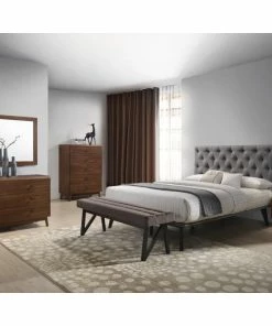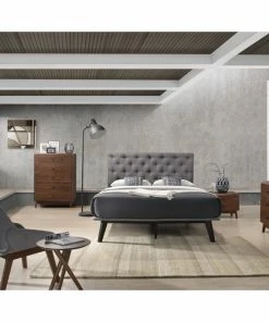Sleep in comfort with the Modrest Gibson Modern Gray Fabric Bed. Upholstered in grey fabric it induces you to a dreamy state so you’ll be able to sleep like a log. Tufted buttons adorn the medium-height headboard. It features slats on the leveled bed frame that allows adequate mattress aeration for that hygienic and healthy feel. Durable black painted wood legs offer sturdy support while sleek wood markings on the surface provide a striking look. Available in Queen & King size the Modrest Gibson modern grey fabric bed is your companion for a restful night so you wake up refreshed in the morning.