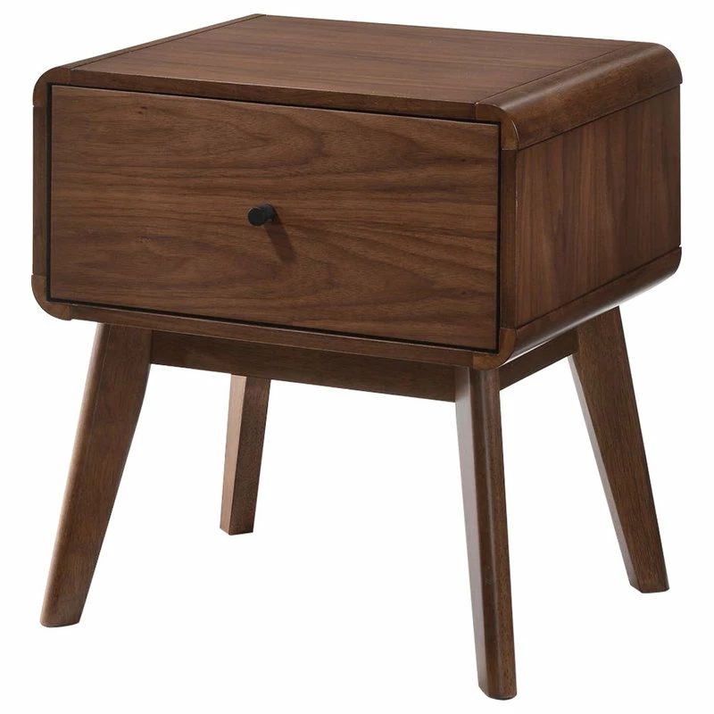 A twist to a little retro mid – century design. The Marshall Nightstand features a one drawer storage with round metal accented handles and a walnut veneer finish.