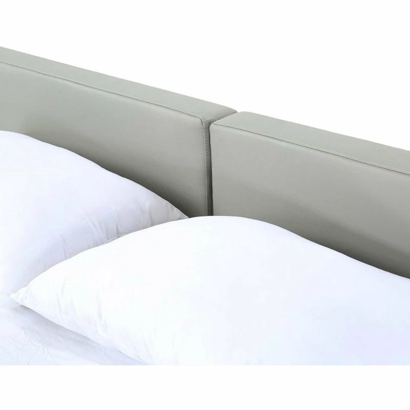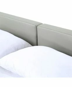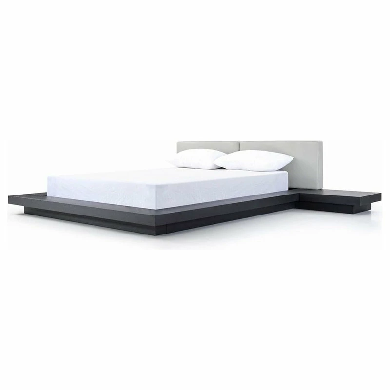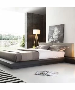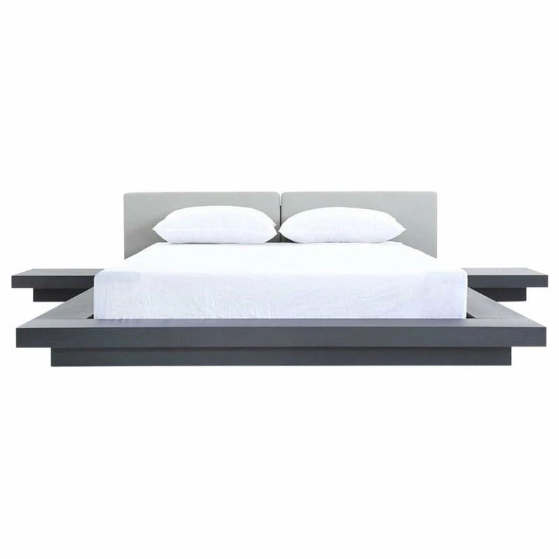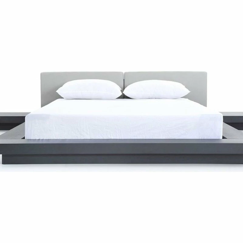 The Modrest Opal modern low profile black oak and grey leatherette platform bed presents an oriental touch with an extended frame made from MDF with black oak veneer finish. The divided grey leatherette headboard provides a stunning contrast to the black oak frame. Low to the ground nightstands are included. Some assembly is required to set up this platform bed