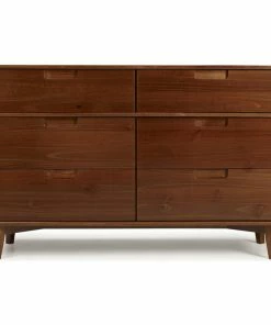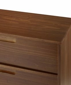 Add storage space into your home for your clothing and extra throws or pillows with this 6 drawer dresser. In a stylish, mid century modern design featuring angled legs and cutout handles of solid pine wood in a stained finish. The intriguing design integrates a transitional aesthetic to complement your home dοΏ½cor. With six storage deep drawers to keep your clothing organized in your bedroom or for blankets and extra bedding in your guest room.