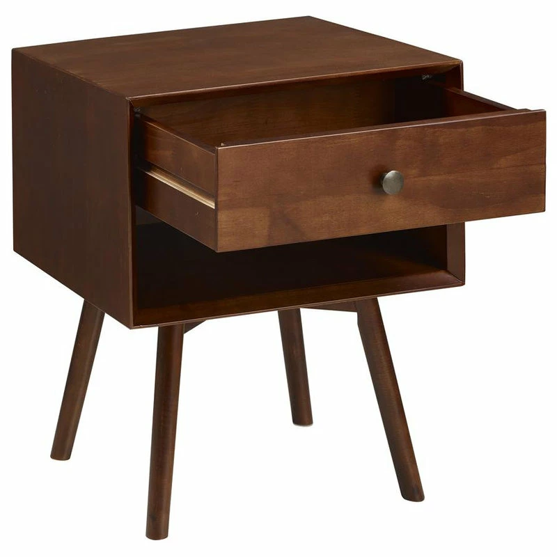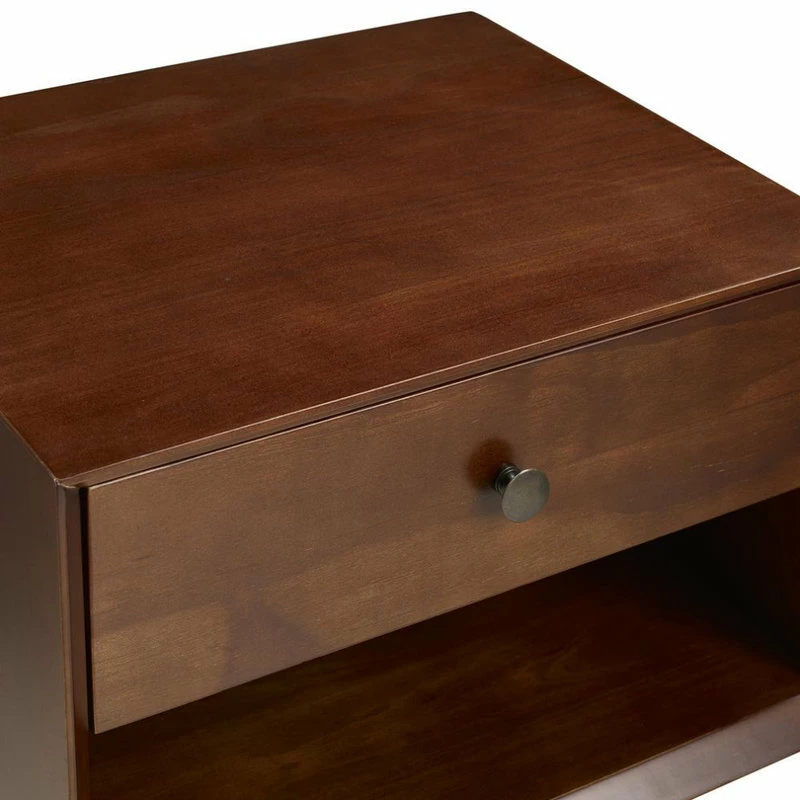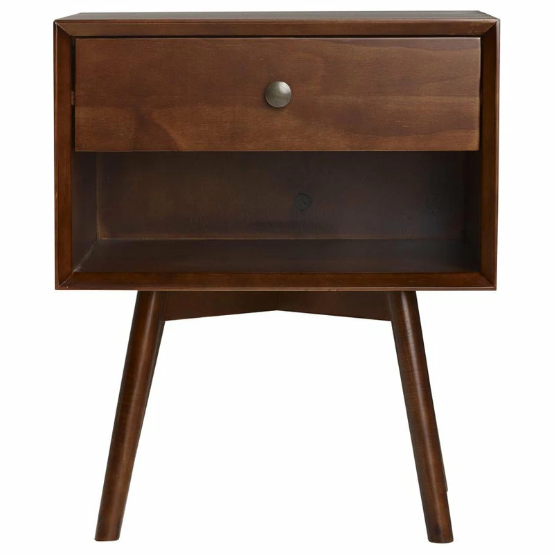 Looking for a side table that wonβt weigh down your space? This mid-century modern nightstand made of beautifully stained pine and antique-finished metal hardware could be the one for you. With beveled front details, open and closed storage for easy accessibility, and its solid wood make-up, this piece is a triple threat of character, function and durability. Made of wood responsibly harvested from renewable forests, this eco-friendly nightstand will allow your environmental conscience to sleep easier. Plus, assembly is a piece of cakeβjust add legs to the top portion and youβll be good to go.