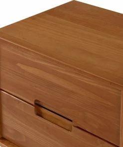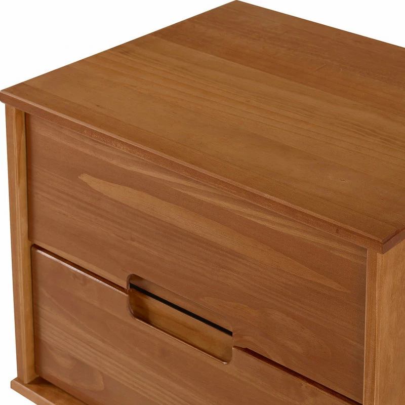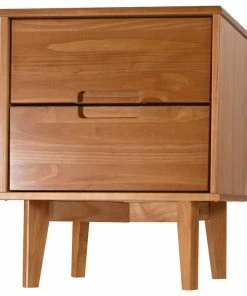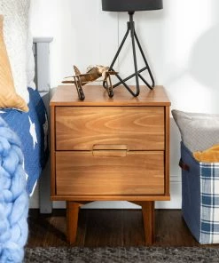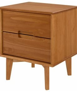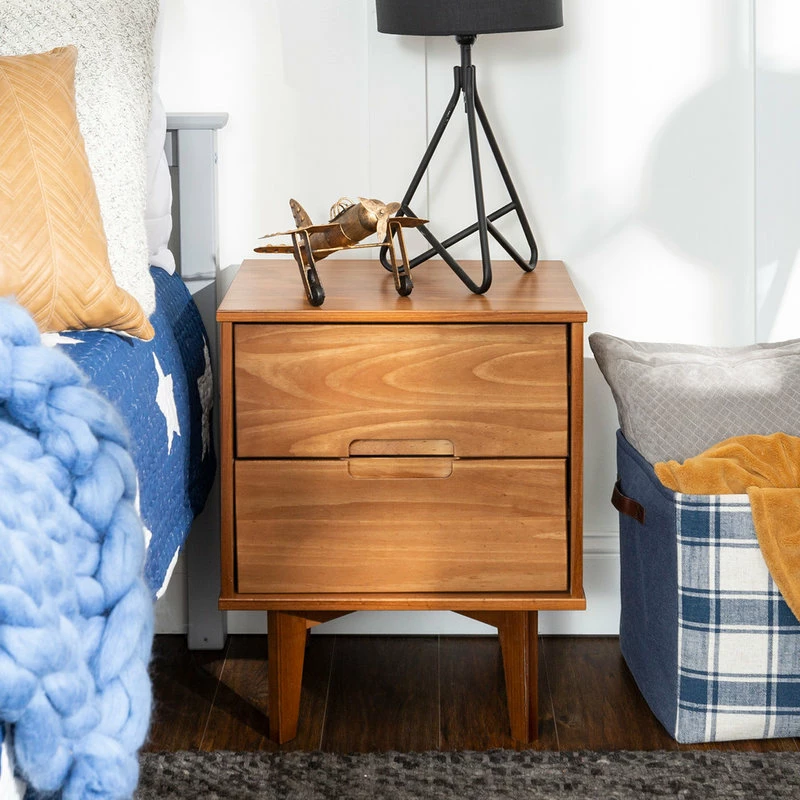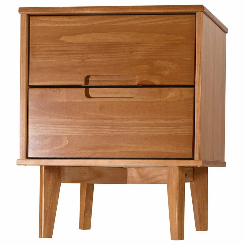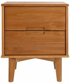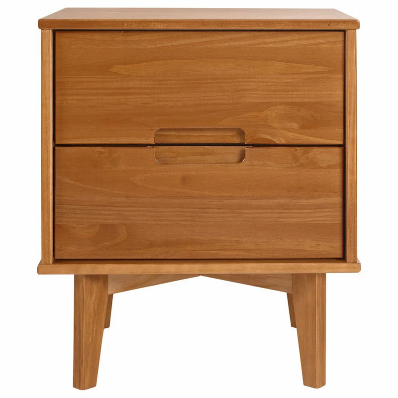 This nightstand will add a stylish finish to your bedroom with the mid century modern and transitional design. With a solid pine wood construction in a stained finish, featuring angled legs and a unique cutout handles that add to the design. Including two storage deep drawers for putting away books, accessories, and more. This nightstand can also be used as a side table or end table in your living room beside your couch or armchair.