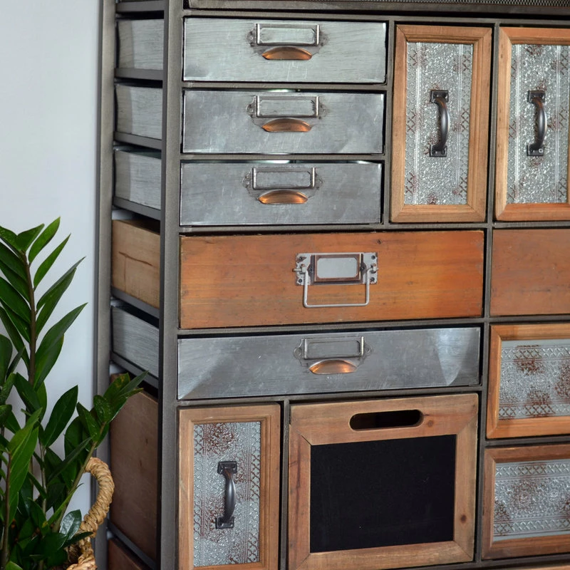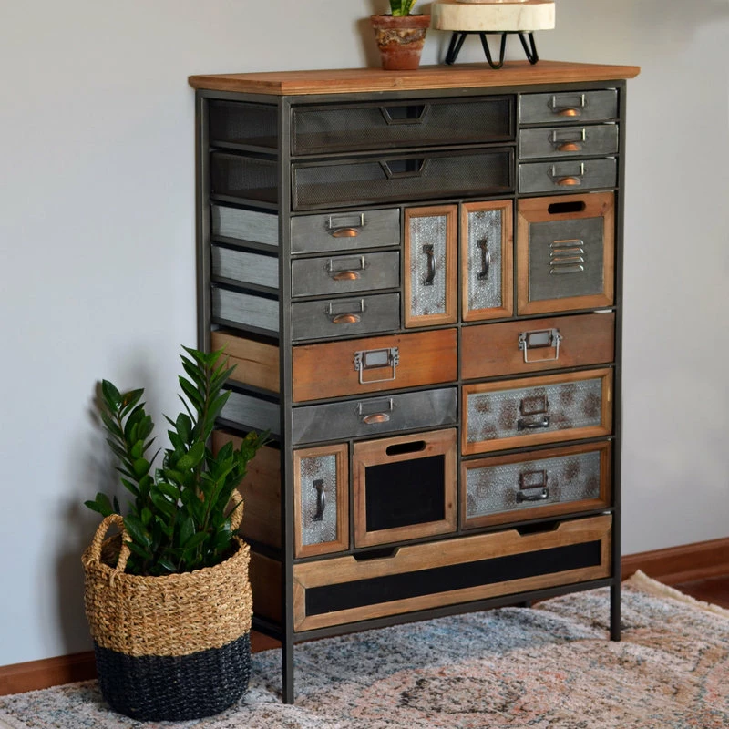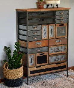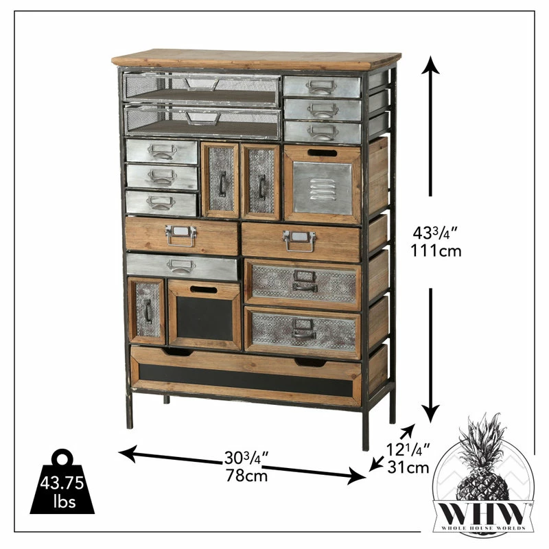 17 DRAWERS AND 2 BINs makes the Industrial Chic Multi Drawer Chest an eye-catching piece that captures the essence of reclaimed vintage style. Set in a sturdy distressed dark iron frame and topped With a solid wood top, this chest has been designed using a clever mix of materials that includes galvanized metal, fir wood, metal screening and more. MADE BY HAND Crafted of fir wood stained warm honey color, the wooden parts of this piece has a distressed finish that makes it look weathered like a vintage piece. As each piece is unique, expect delightful variations in color and deliberate imperfections in the wood finish. WELL SIZED this piece measures as follows: 30 3/4 L x 12 1/4 W x 43 3/4 H”. A HANDY AND STRIKING ADDITION to any room of the house, this distinct chest is fantastic to act as chic accent piece that also holds things you need to keep close at hand. Use your own labels in the library drawer pulls to keep track of what you can’t see. AN IDEAL GIFT FULL OF PERSONALITY AND CHARM, it’s perfect to celebrate holidays, birthdays, weddings and many more. So gorgeous, you’ll want to keep it at home for yourself. Enjoy! By Whole House Worlds Welcome to the product line of Whole House Worlds. The New York based company offers high quality, stylish products for every room in the house, and beyond. From the kitchen, to the living room, to the bedroom, dining room, home office, closet and garden: Our criteria are comfort, quality, style and value.