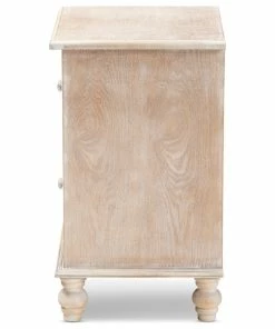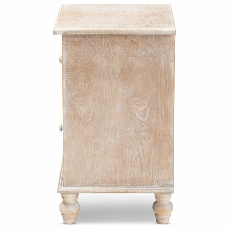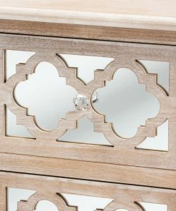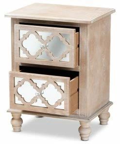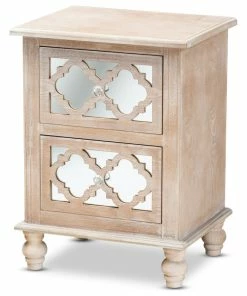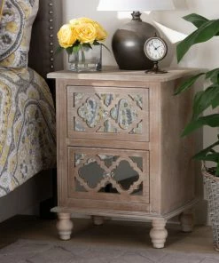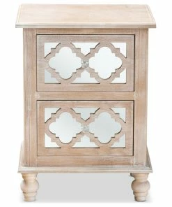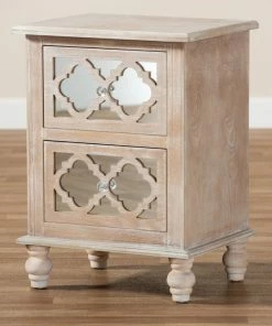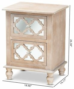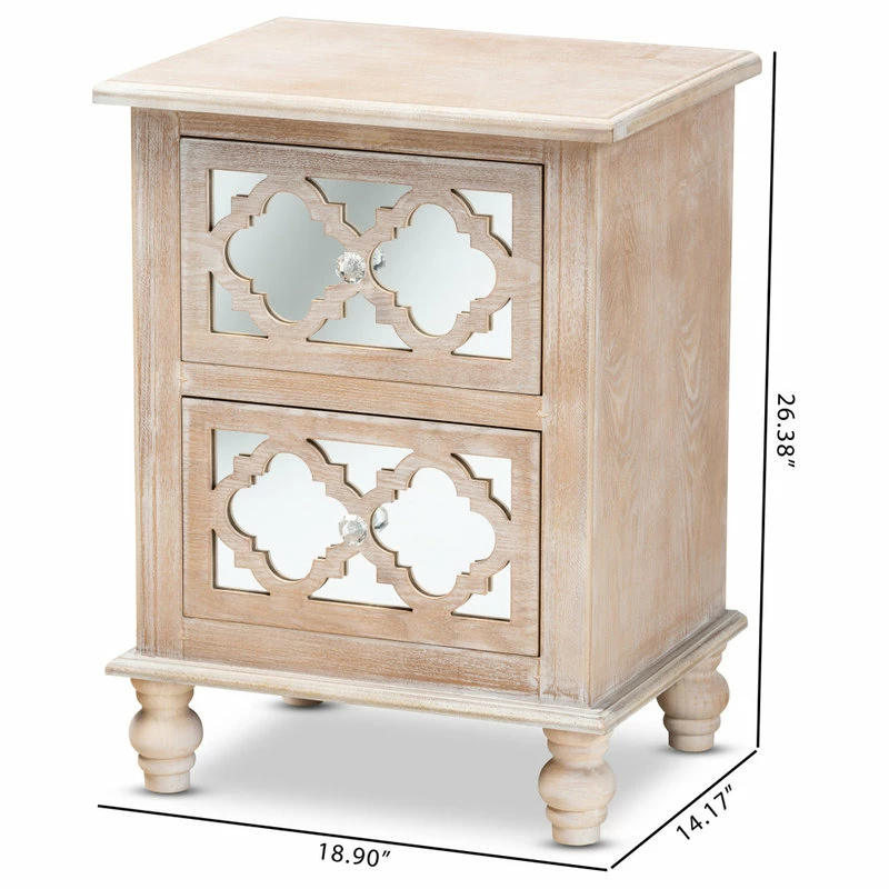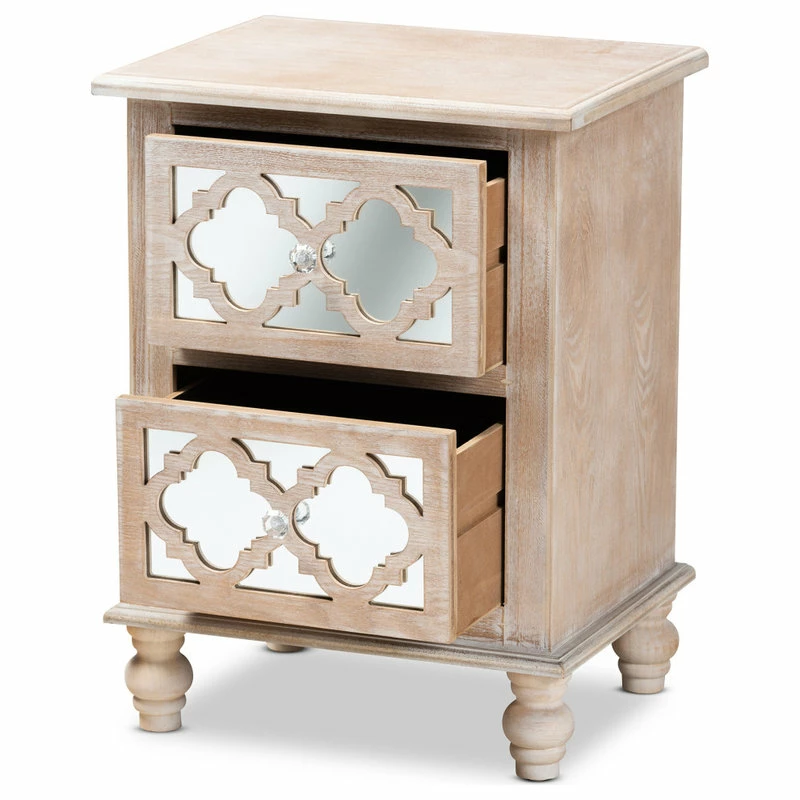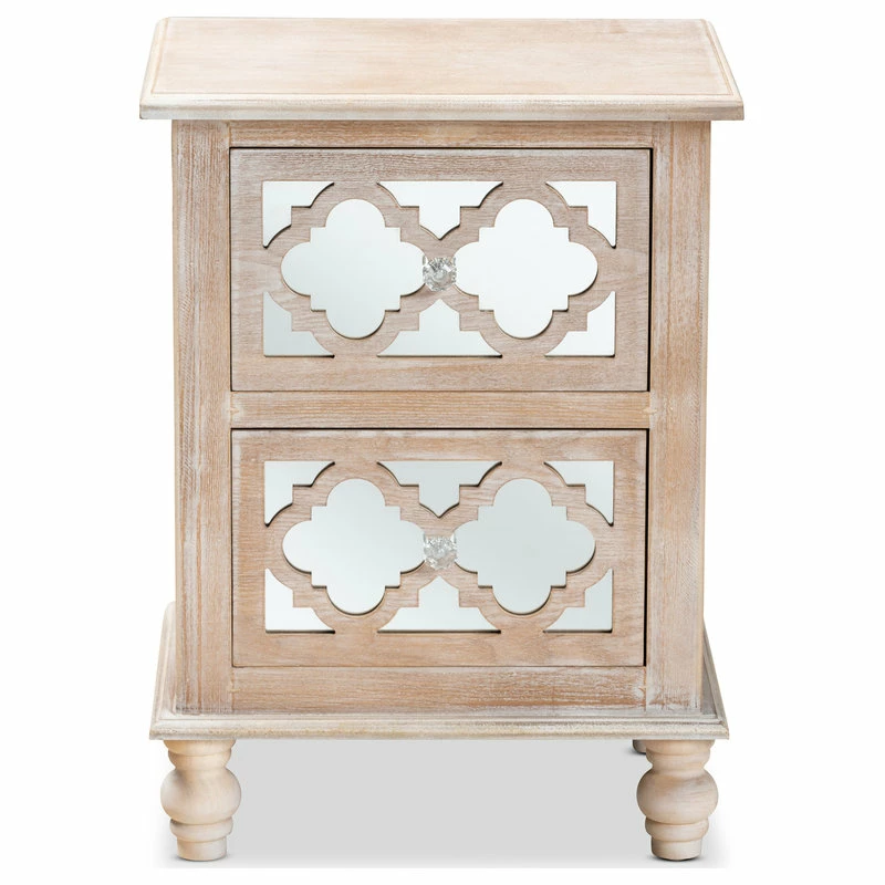 A unique mix of rustic and glam makes the Celia nightstand a chic bedside companion. This wood nightstand displays a white-washed oak finish for an aged, vintage look. Two drawers provide ample space to store all the bedroom essentials. Mirrored glass adds a hint of glamour and highlights the elegant quatrefoil pattern layover. Crystal knobs and turned feet add an extra dose of charm. The Celia nightstand is made in China and will arrive fully assembled.